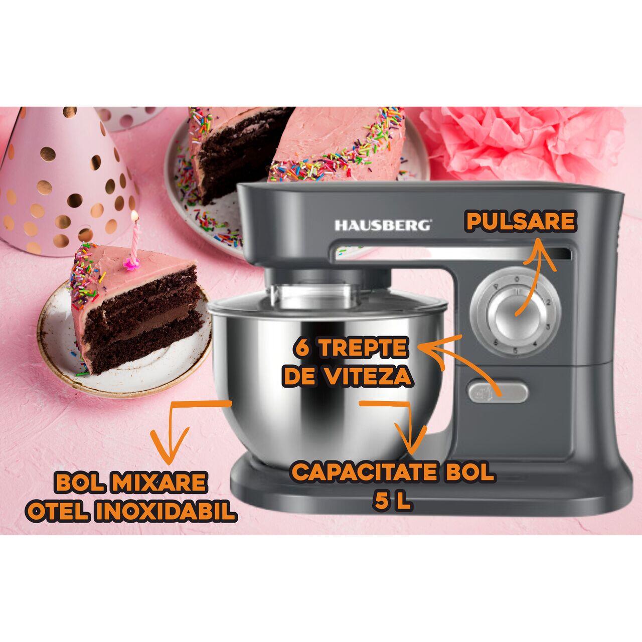 Mixer cu bol HAUSBERG HB-7620GR, putere 700-800W, 5 litri, 6 viteze, Gri